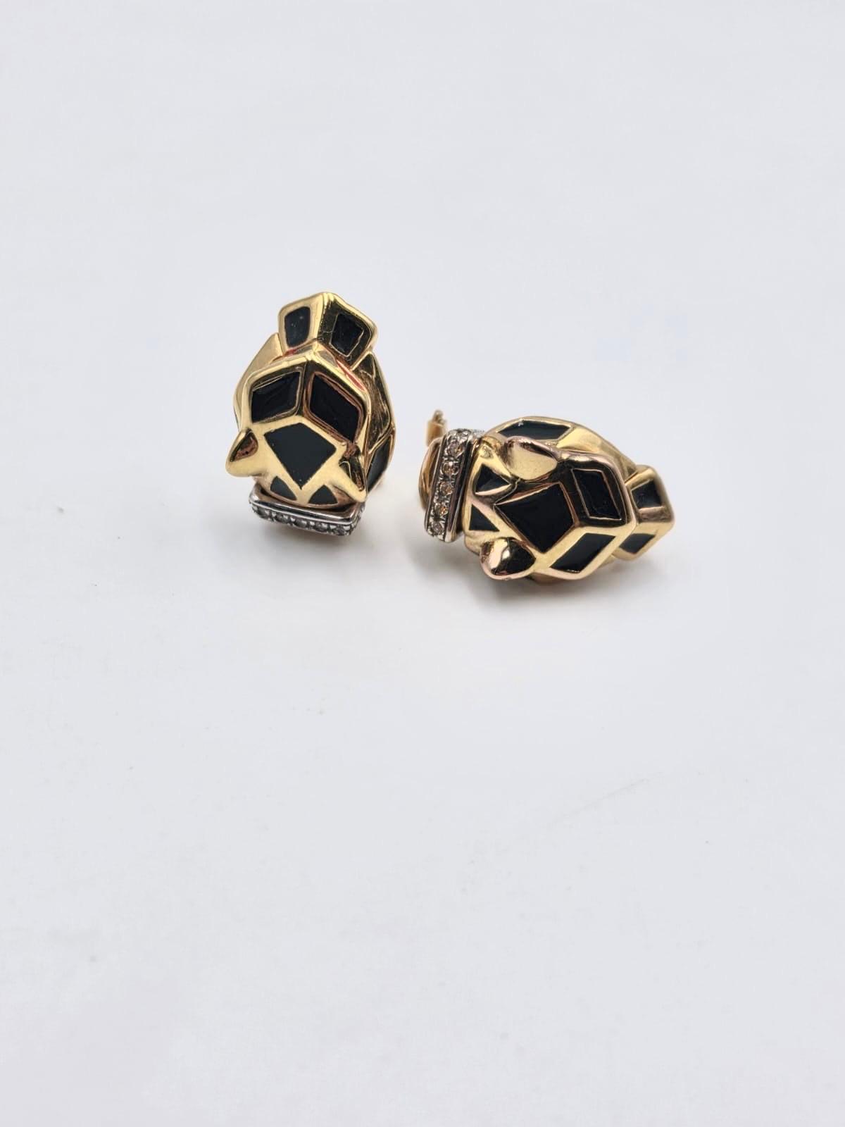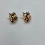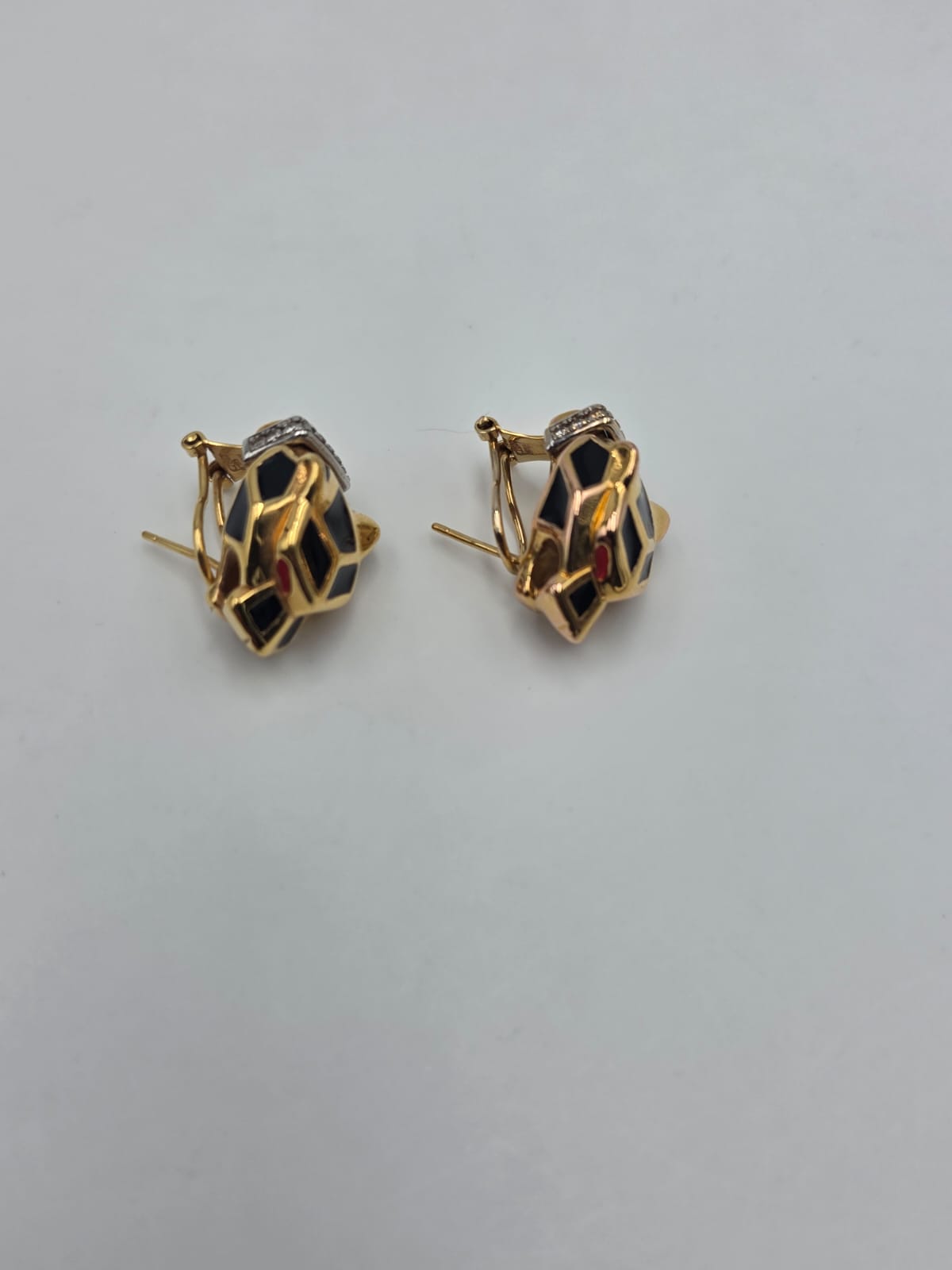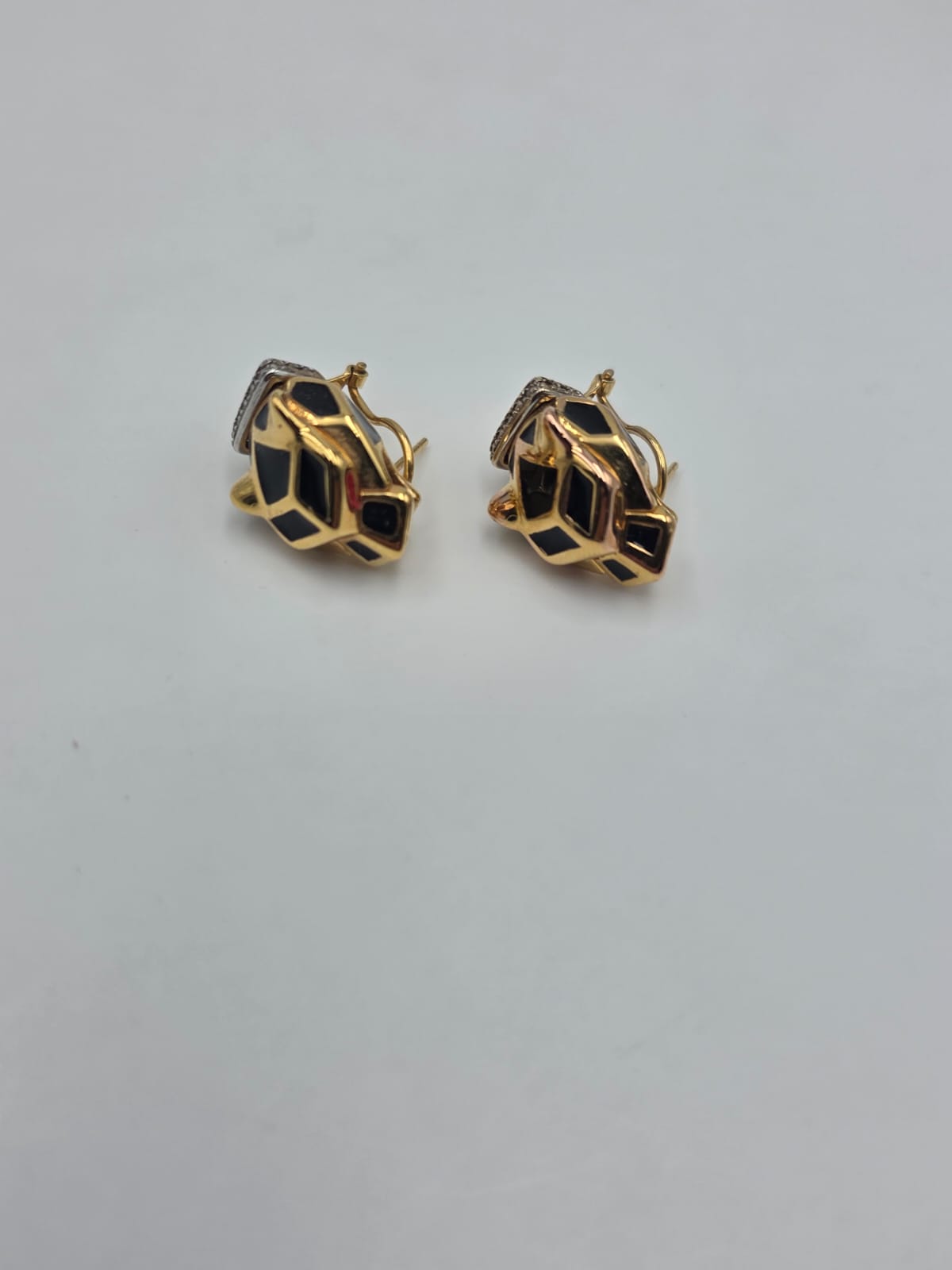 Splendidi orecchini a forma di viso di pantera in oro giallo 18 carati a lobo con inserti in smalto nero e occhi rossi.