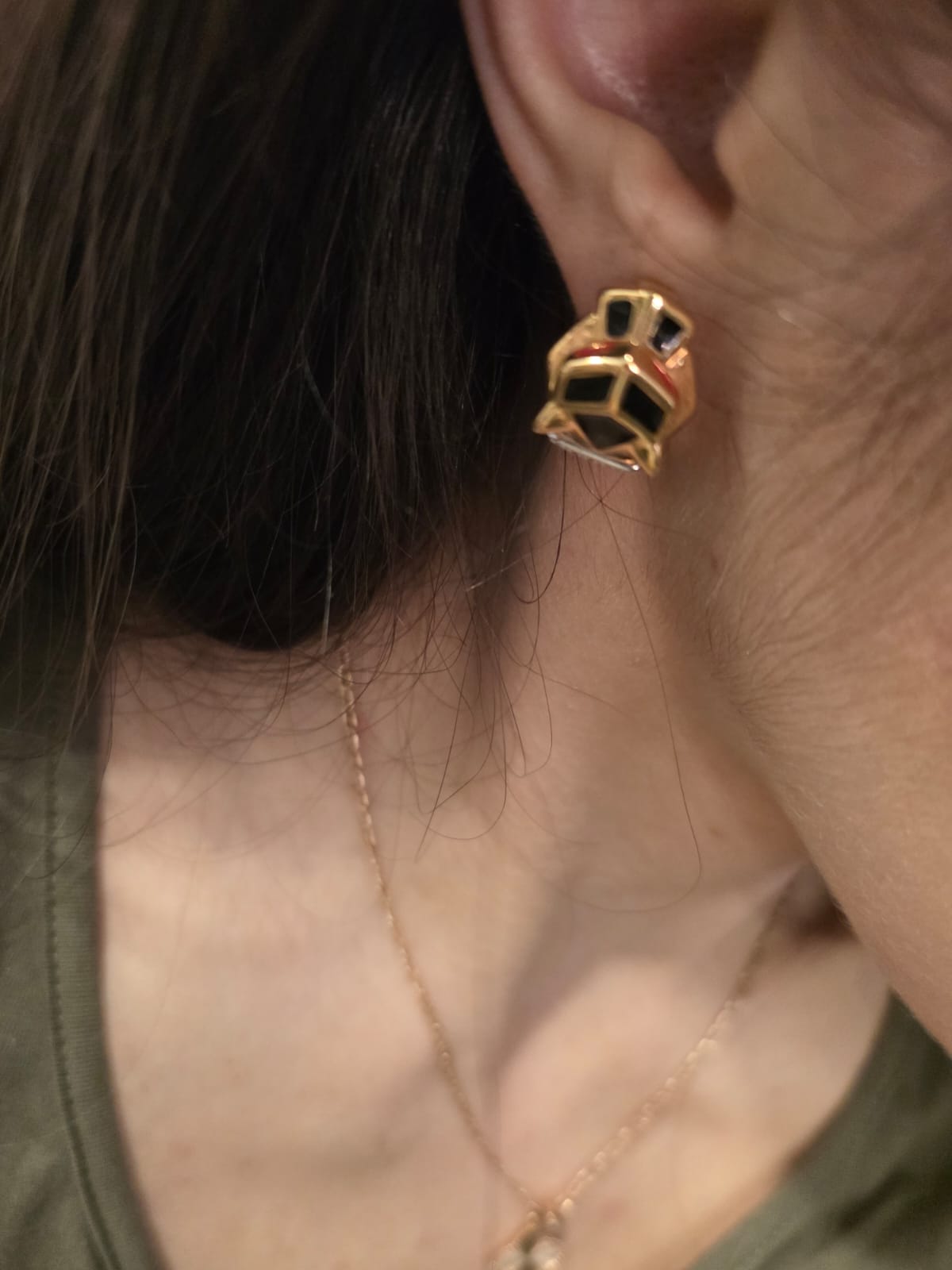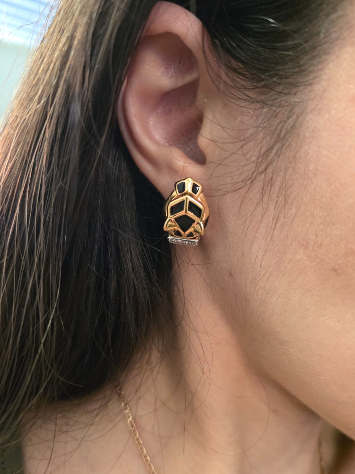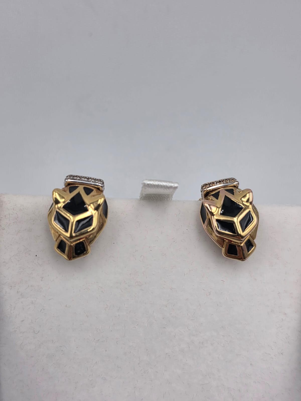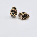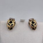 Splendidi orecchini a forma di viso di pantera in oro giallo 18 carati a lobo con inserti in smalto nero e occhi rossi.