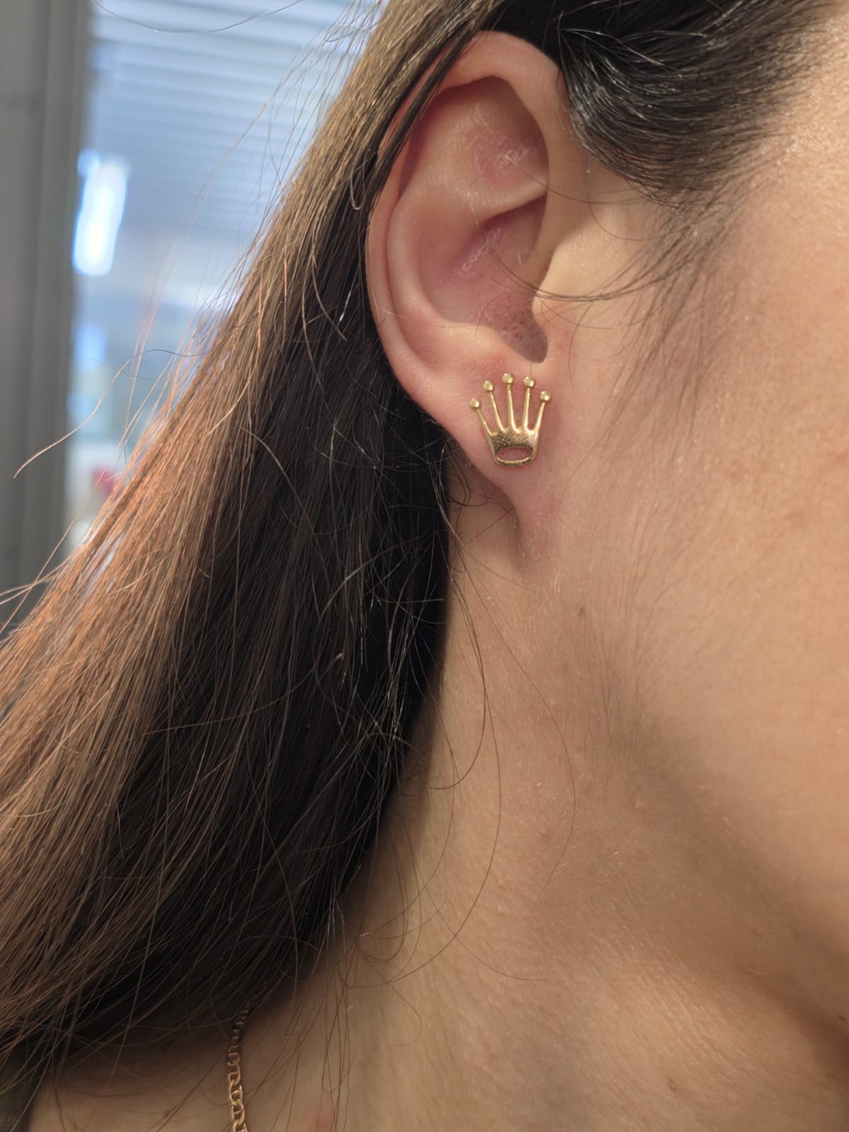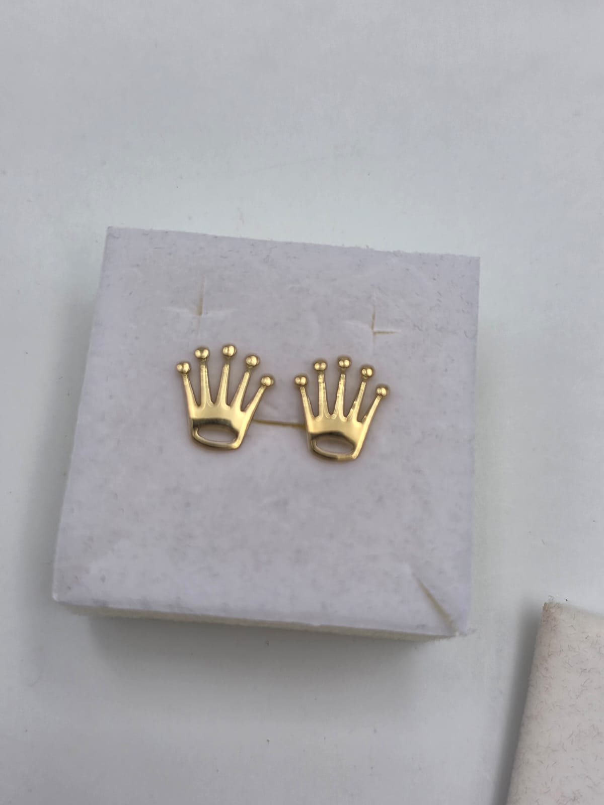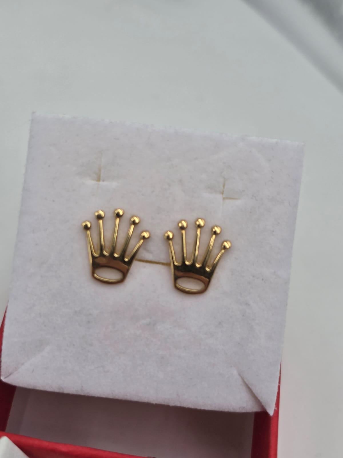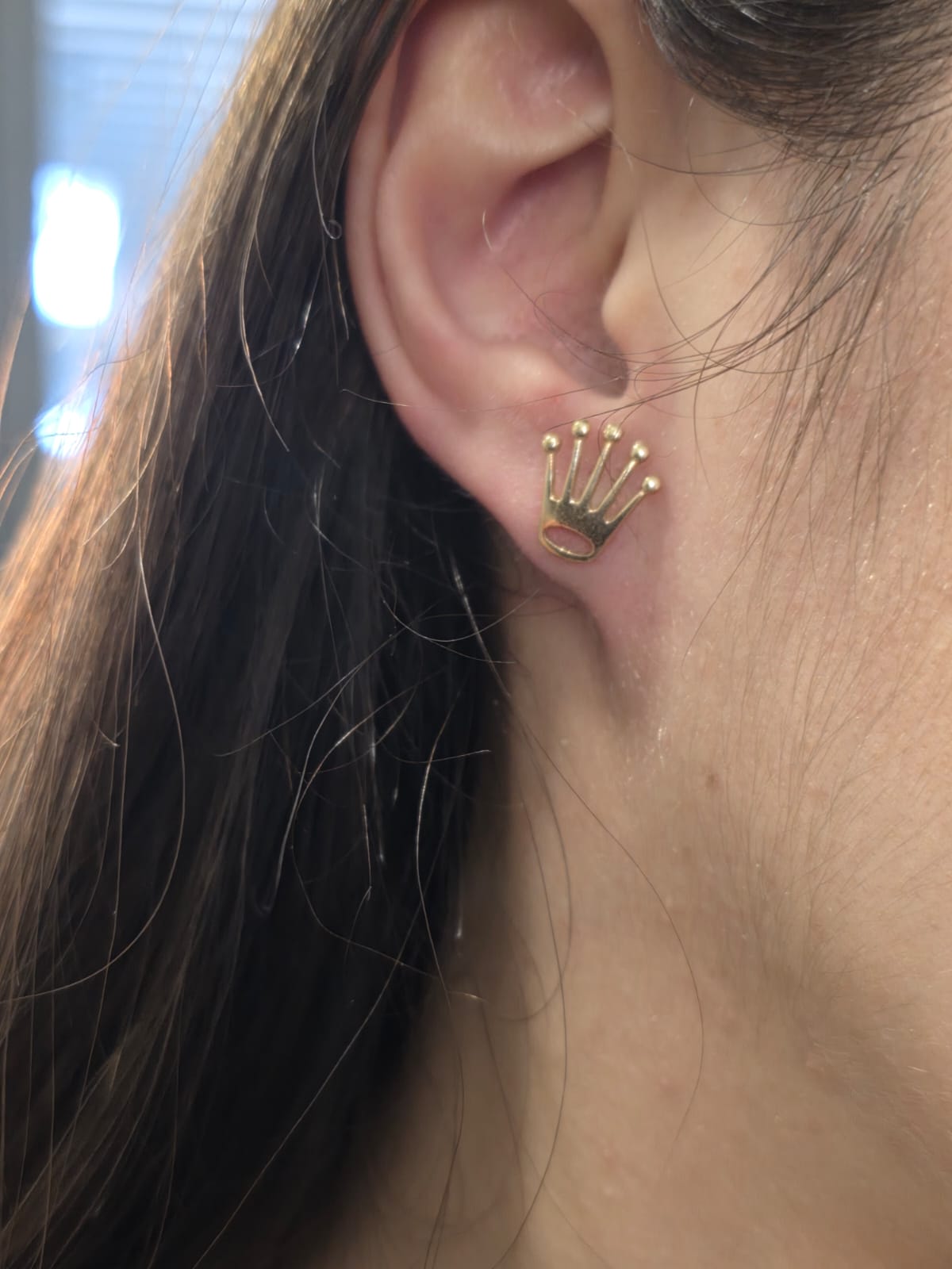 Bellissimi orecchini in oro giallo massiccio 18 carati in stile Rolex a coroncina del brand.